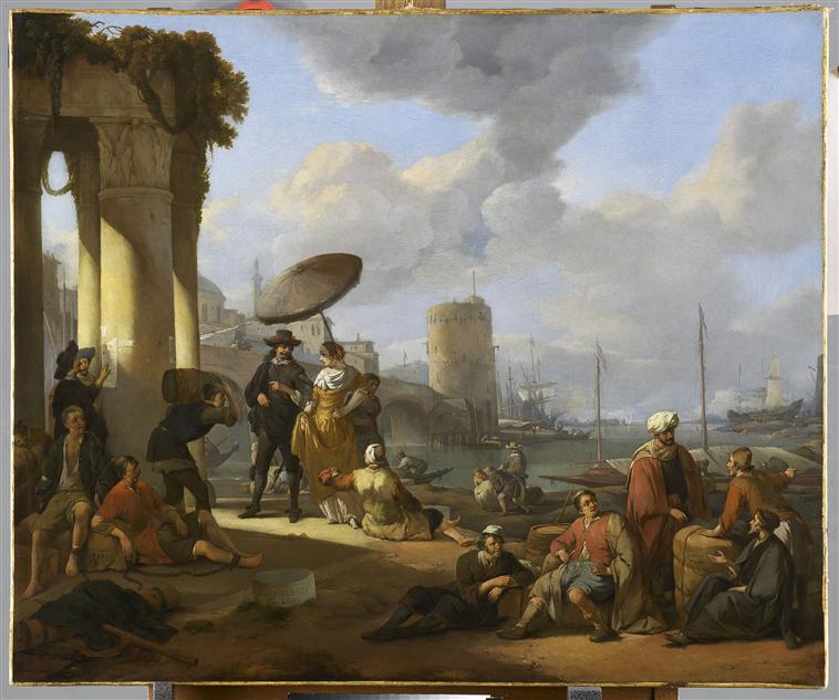 scène (port, Italie, bateau, homme, femme, portage, gueux, ombrelle, colonne)