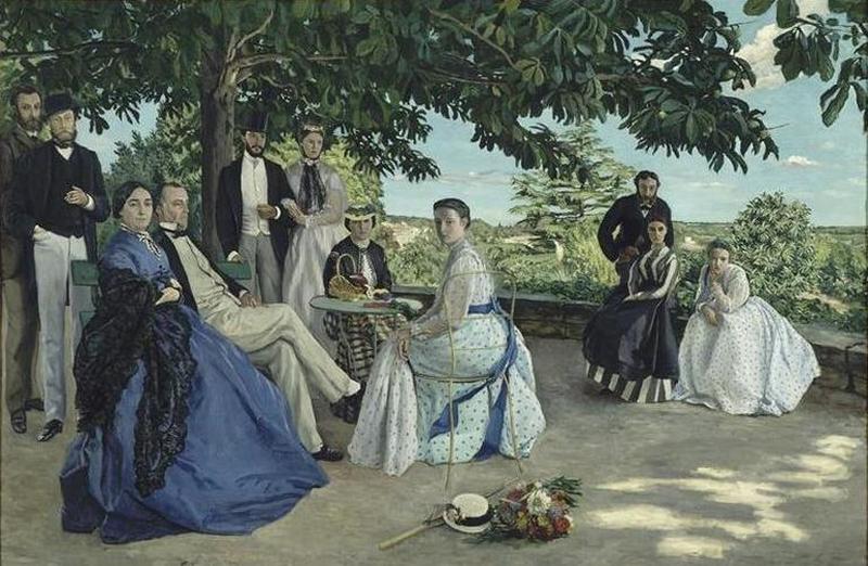 portrait collectif (Hours Eugène des, Hours Mme des, Hours Thérèse des, Auriol Thérèse, Hours Camille des, Pagesy Camille, Bazille Marc, Bazille Suzanne, Tissié Suzanne, Teulon Emile, Hours Pauline des, Teulon Pauline, Bazille Gaston, Bazille Camille, Vialars Camille, homme, femme, en pied, assis, , marronnier, robe (rayure) ; robe (pois) ; chapeau ; bouquet ; terrasse ; effet de soleil ; Castelnau-le-Lez) ; autoportrait (Bazille Frédéric, homme, en pied, de face, peintre) ; fond de paysage (feuillu, résineux, colline, Hérault d)