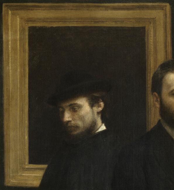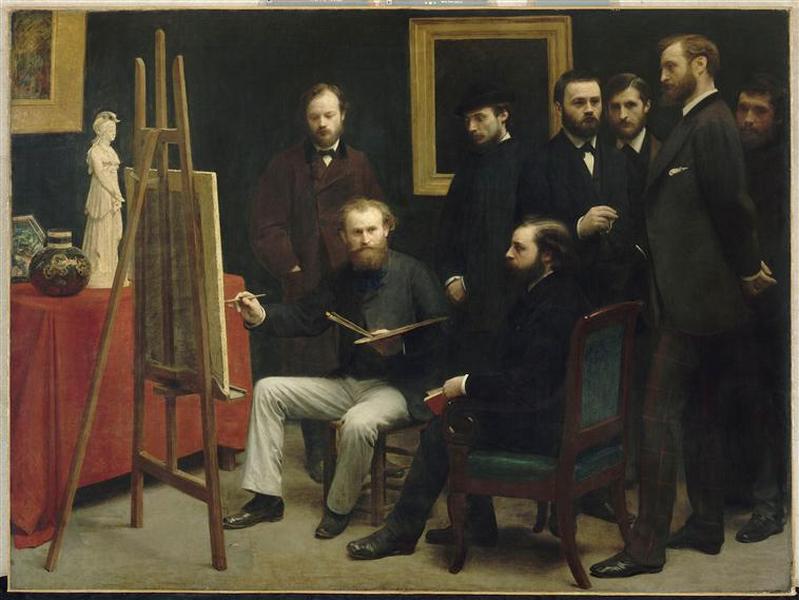 scène ; portrait collectif (Manet Edouard, homme, assis, de face, peintre, art de la peinture, visite, Astruc Zacharie, homme, assis, de profil, livre, homme de lettres, Scholderer Otto, homme, en pied, de face, peintre, Renoir Pierre Auguste, homme, en pied, de trois-quarts, chapeau, peintre, Zola Emile, homme, de face, homme de lettres, Maître Edmond, homme, en pied, de face, musicien, Bazille Frédéric, homme, en pied, de profil, peintre, Monet Claude, homme, en pied, de face, peintre, intérieur : atelier d'artiste, tableau, table, ronde bosse : Minerve, récipient : céramique)