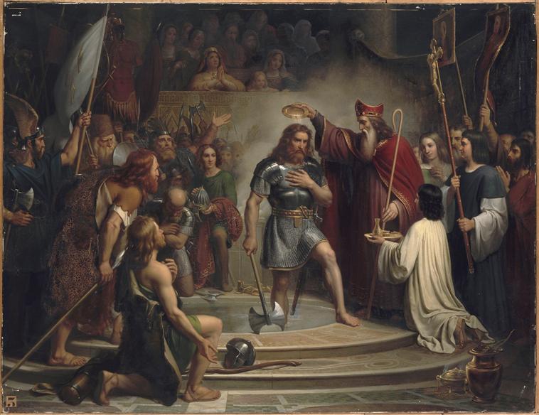 scène historique (baptême d'adulte : Clovis Ier, saint Remi de Reims : évêque)
