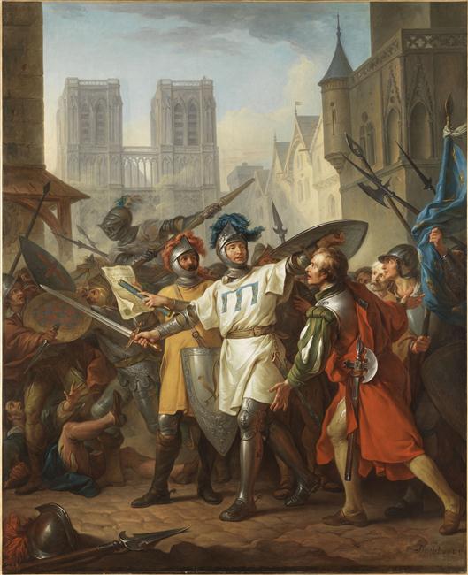 scène historique (prise de place : Paris, escarmouche, connétable, soldat) ; casque ; arme ; maison ; cathédrale
