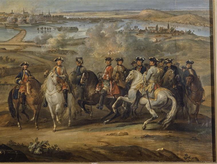 scène historique (guerre de siège, ville : Mons-en-Hainaut, Conti prince de, Boufflers Joseph duc de, Estrées comte d', camp militaire) ; moulin