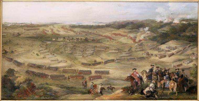 scène historique (guerre de siège, bataille rangée, village, Estrades Godefroy d', Cumberland duc de)