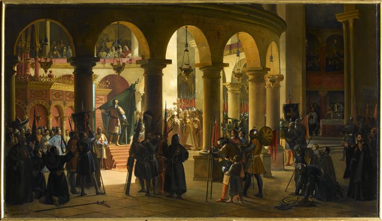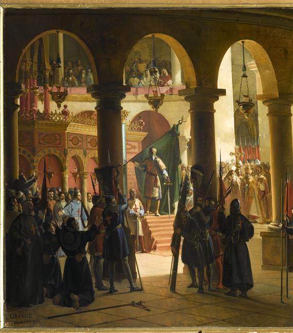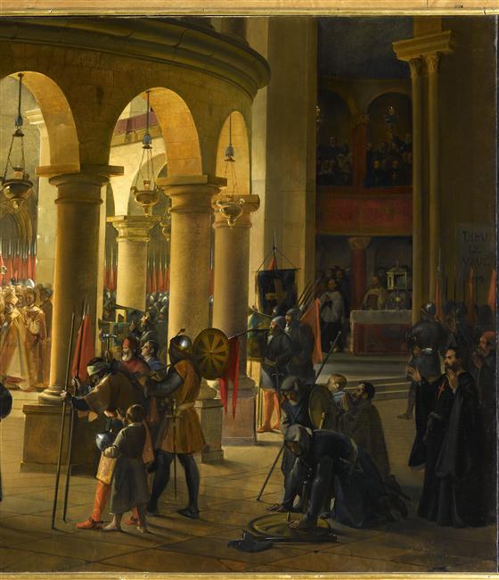 scène historique (Première croisade, Godefroi de Bouillon, soldat, trophée de guerre, Jérusalem, église : intérieur)