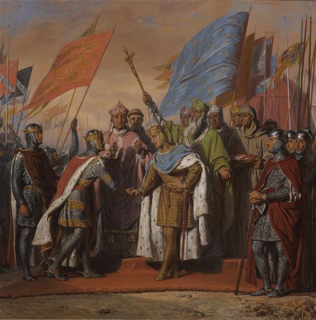 scène historique (Philippe II Auguste, Henri II Plantagenet, entrevue, poignée de main, croisade, bénédiction, Gisors)