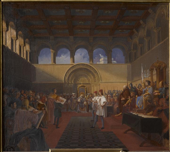 scène historique (assemblée, nation : Jérusalem, Godefroi de Bouillon, attribut de la royauté, croisade)