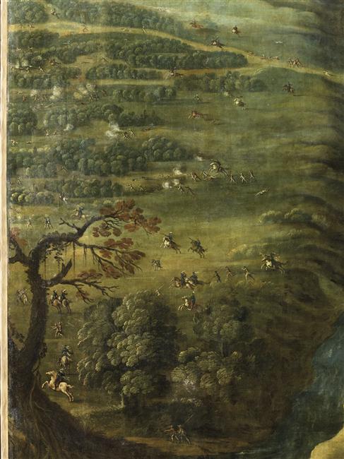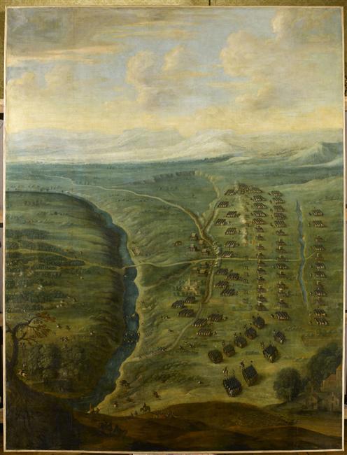 provient de la galerie du château de Richelieu ; appartenait à une suite de tableaux représentant des villes prises et des batailles gagnées sous le ministère du cardinal de Richelieu ; numéros d'inventaire des autres éléments : MV 593, MV 607 à MV 616