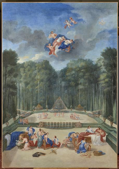 vue d'architecture (parc : Versailles, décor de jardin, fontaine, bassin d'eau) ; vase ; Vénus (toilette) ; serviteur ; siège ; table ; danse