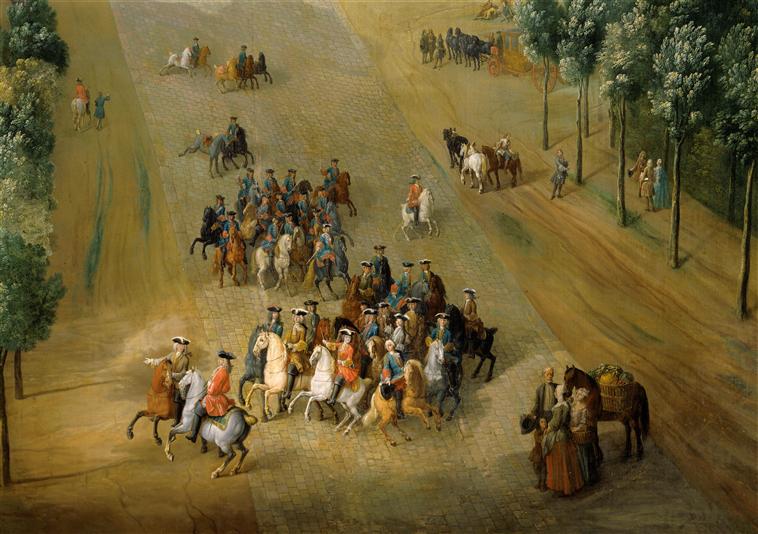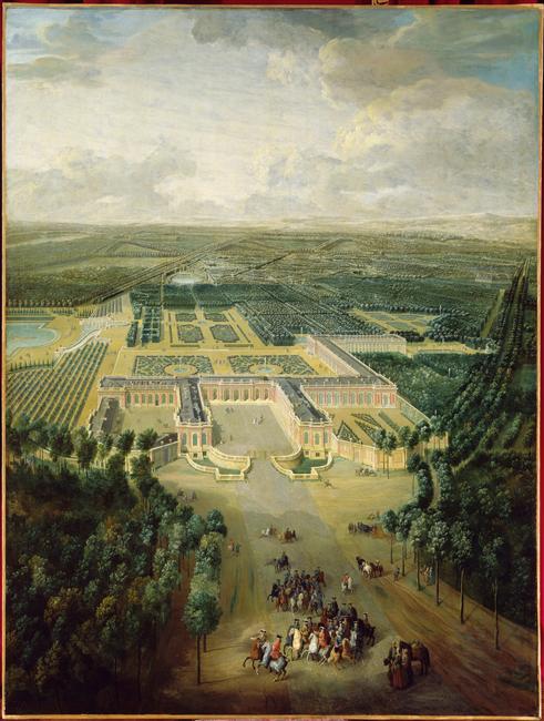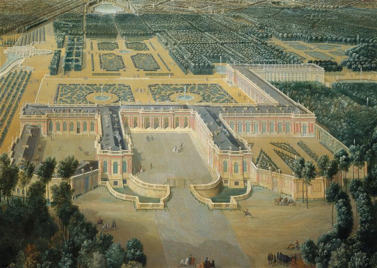 vue d'architecture (château, Versailles, vue panoramique, façade, cour, portail, jardin, cavalier, Louis XV, noblesse, paysan, carrosse)