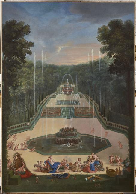 paysage (parc : Versailles, bassin d'eau, fontaine, jet d'eau) ; scène mythologique (putti, divinité, arme, vaisselle, siège)