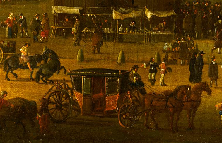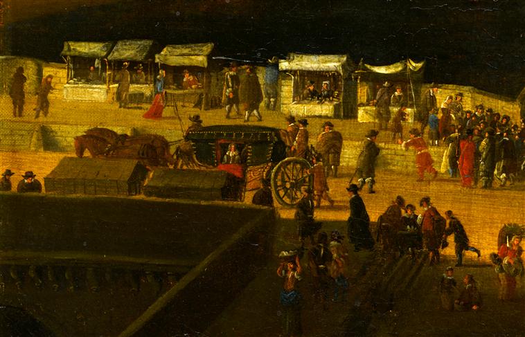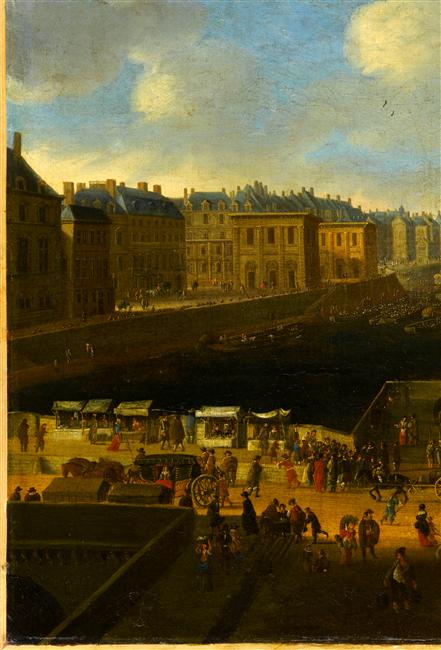 paysage (vue d'architecture, ville : Paris, palais, statue : Henri IV, attroupement, carrosse, échoppe, bateau, charrette, pont)