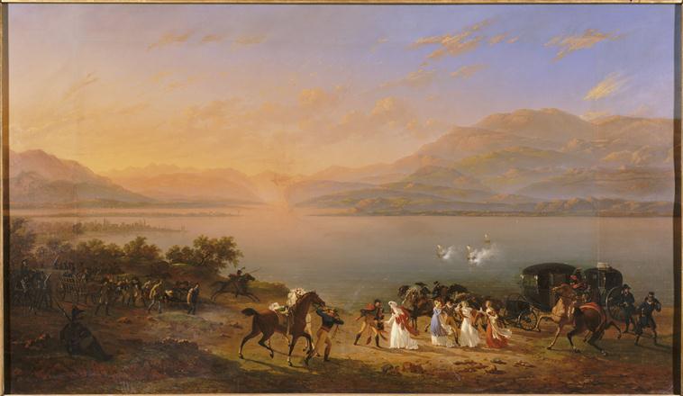 scène historique (mouvement d'armée, voiture à attelage : cheval, cavalier, Joséphine, impératrice, femme, lac, Italie)