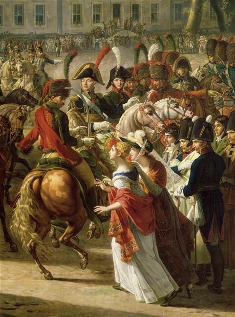 scène historique (visite officielle, cortège, Berlin, attroupement, arc, soldat, Berthier Louis Alexandre, Davout Louis Nicolas, Augereau Charles Pierre François, Caulaincourt Armand Augustin Louis marquis de, Lefebvre François Joseph, Duroc Géraud Christophe Michel)