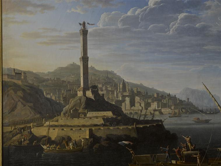 paysage (port, ville : Gênes, colline, fortification, phare, bateau, mer, barque)