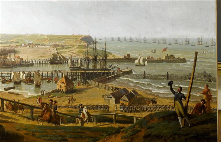 scène historique (Napoléon Ier, cheval, état-major, marine, lettre, port, bateau)