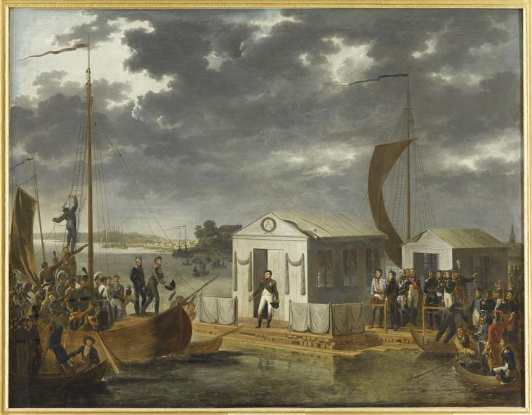 scène historique (entrevue, ville, Niémen, Russie, empereur, Napoléon Ier, Ney Michel, état-major, bateau, abri, radeau, barque, Bessières Jean-Baptiste, Murat Joachim, Constantin Pavlovitch, Alexandre Ier de Russie, Neufchâtel prince de)