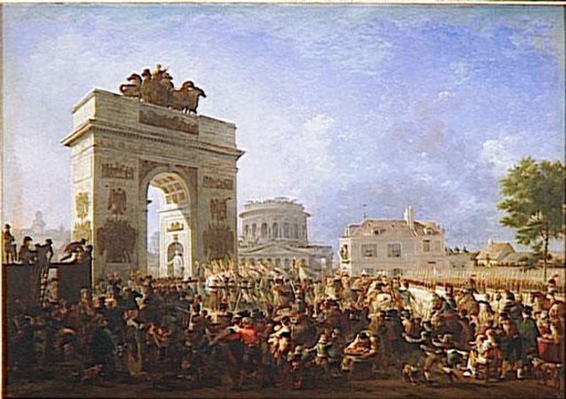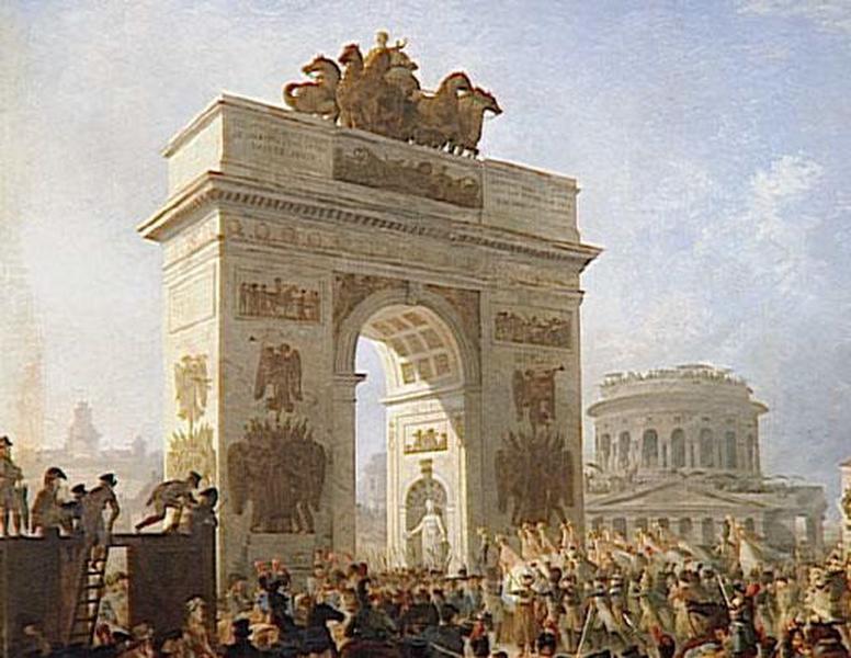 scène historique (défilé, arc monumental, infanterie, cavalerie, attroupement, commerçant, couple, charpentier, ville, Bessières Jean-Baptiste, maréchal, haut fonctionnaire, Frochot Nicolas Thérèse Benoît comte)