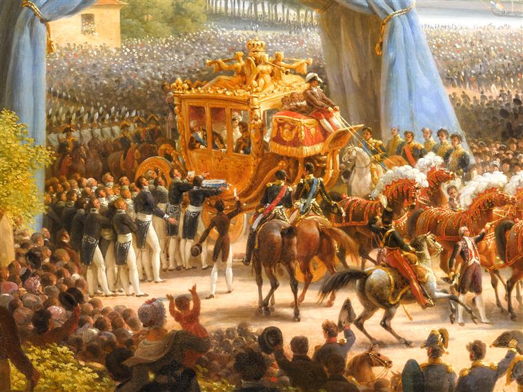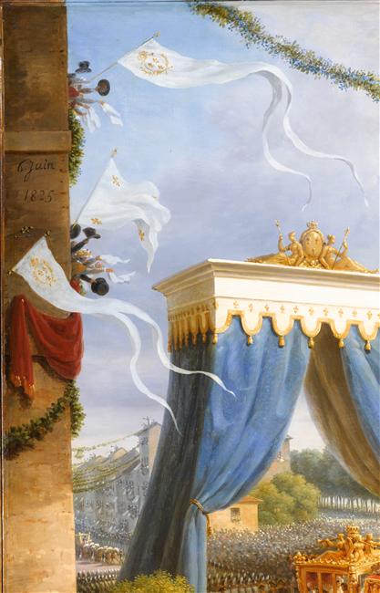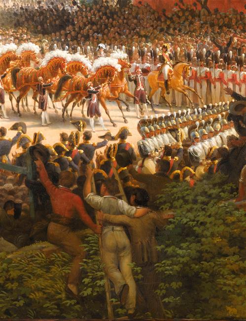 scène historique (porte de ville, foule, cavalcade, harnachement, carrosse : Charles X, soldat, arrivée, acclamation)