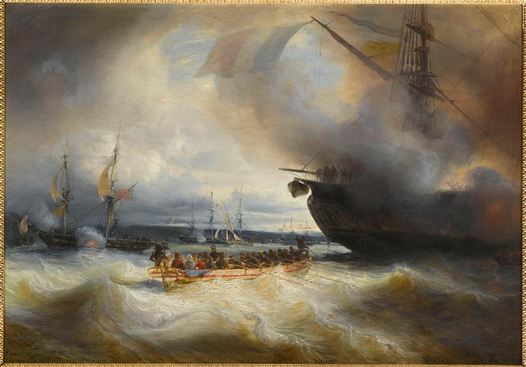 scène historique (visite officielle : Louis-Philippe Ier, marine, tempête, vague, bateau à rames, Cherbourg, Manche)