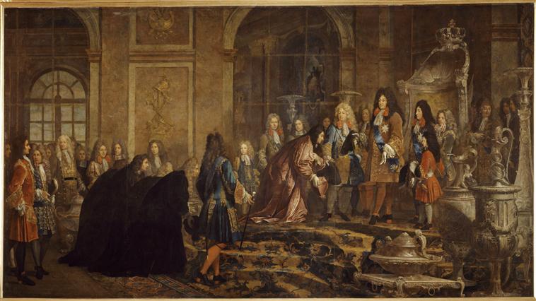scène historique (entrevue : Louis XIV, magistrat : Gênes, soumission, prince héritier, Orléans duc d', réunion : noblesse, mobilier : argent, trône, vaisselle, habit, Ordre du Saint-Esprit, Duras duc de, Imperiali Francesco Maria, haut fonctionnaire)