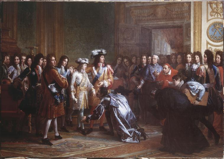 scène historique (nomination : Philippe V d'Espagne, Louis XIV, Orléans duc d', prince héritier, Bossuet Jacques Bénigne, réunion : noblesse, ambassadeur, agenouillé, vue d'intérieur)