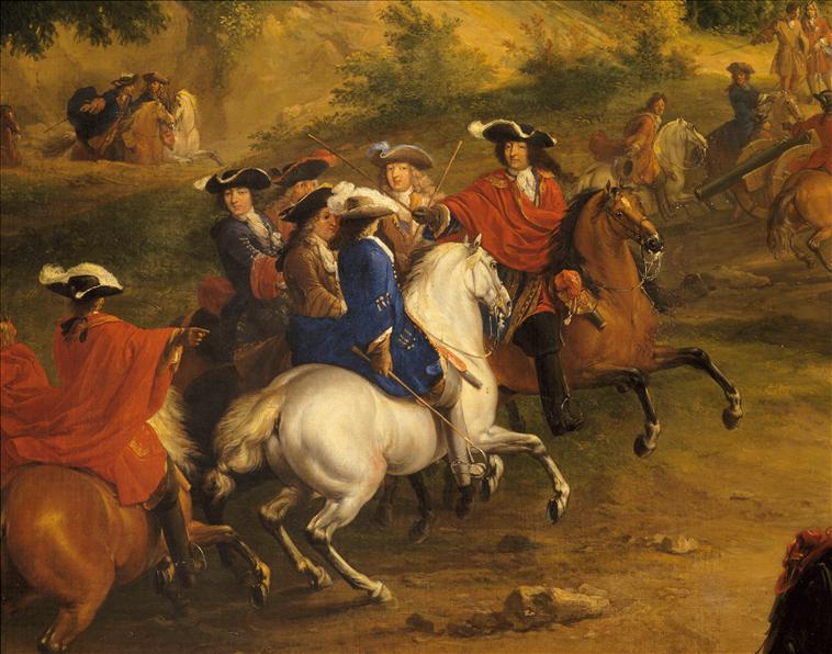 scène historique (prise de place : Namur, Belgique, mouvement d'armée : infanterie, cavalerie, ville, fortification, château, Louis XIV, prince héritier, harnachement, état-major)