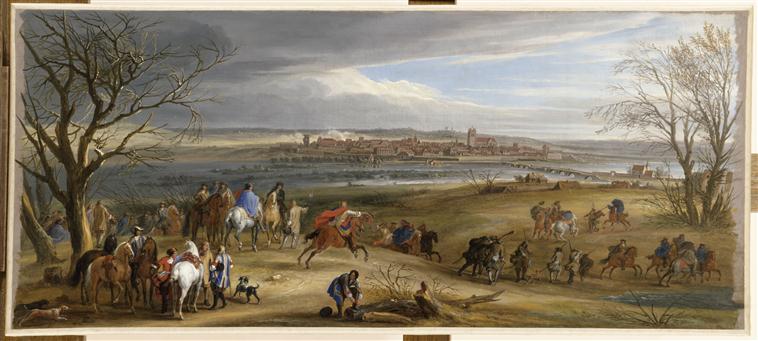 scène historique (prise de place : Dôle, mouvement d'armée, infanterie, cavalerie, ville, fortification, rivière, chien)