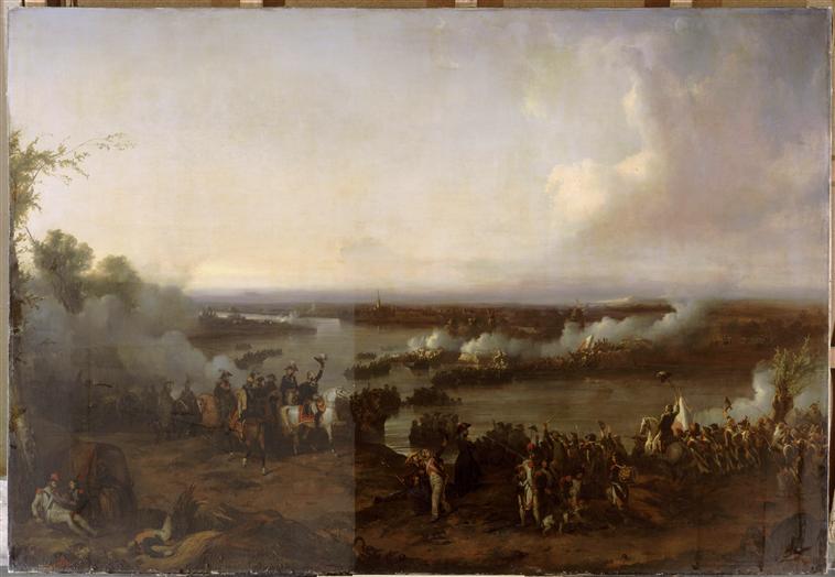 scène historique (mouvement d'armée, Rhin, ville : Düsseldorf, Allemagne, Championnet Jean Etienne : état-major, cavalerie, infanterie, barque, blessé)