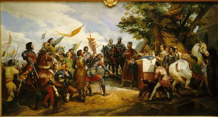 scène historique (bataille : Bouvines, Philippe II Auguste, assemblée : noblesse, soldat, religieux, autel : couronne, cheval, serviteur, chien, acclamation, soumission)