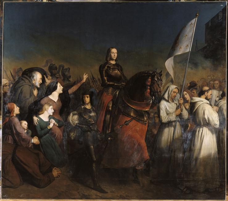 scène historique (guerre de Cent ans, prise de place : Orléans, Jeanne d'Arc : équestre, cheval, chevalreligieux, attroupement : acclamation, armure, caparaçon, drapeau, fleur de lys)
