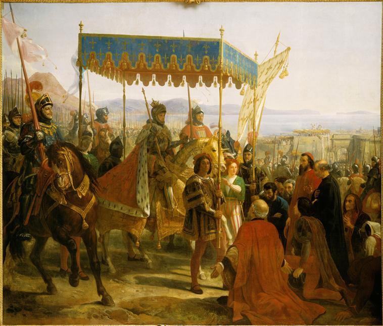 scène historique (reddition : Naples, Charles VIII, notable : soumission, défilé, cavalier, armure, attribut de la royauté, drapeau)