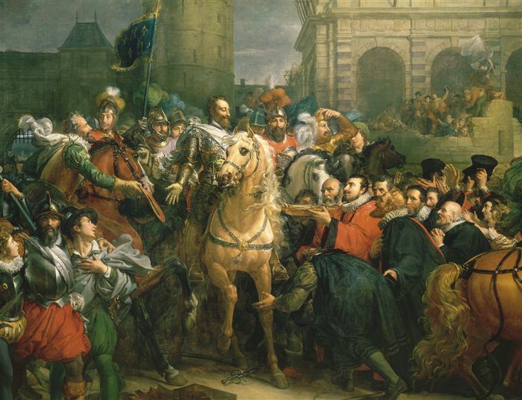 scène historique (prise de place, remise des clés, Paris : palais, Henri IV, Brissac duc de, Montmorency Henri Ier de, Crillon seigneur de, Retz duc de, Sully, Estrées Gabrielle d', Matignon Jacques de, Espinay François d', Néret Mr, acclamation, accolade, soumission, protection, fortification, foule, habit : magistrat, armement)