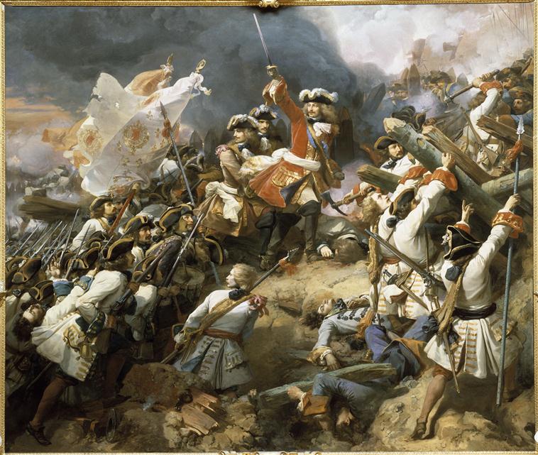 scène historique (bataille : Denain, Villars Louis Claude Hector de, assaut, tranchée, habit : infanterie, drapeau, mort)