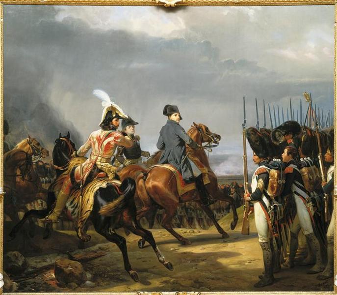 scène historique (bataille : Iéna, Napoléon Ier, équestre, cheval, Murat Joachim, Berthier Louis Alexandre, revue : infanterie, uniforme, emblème)
