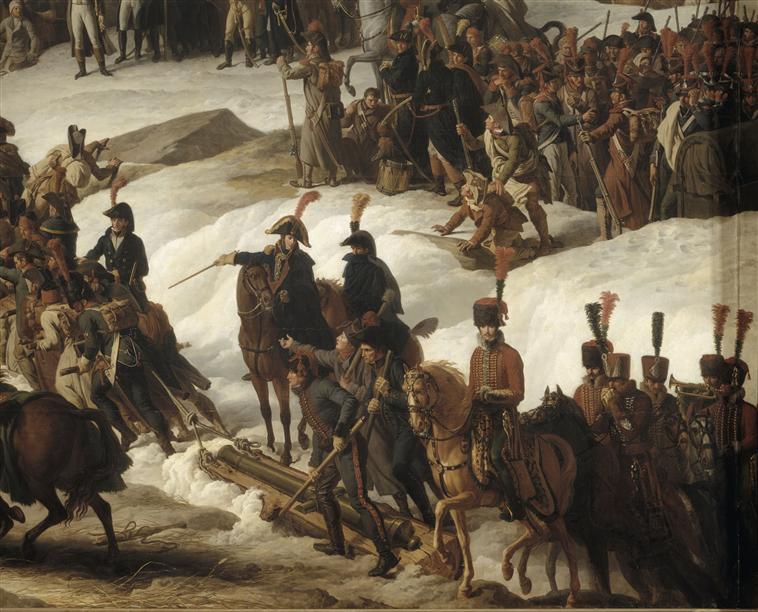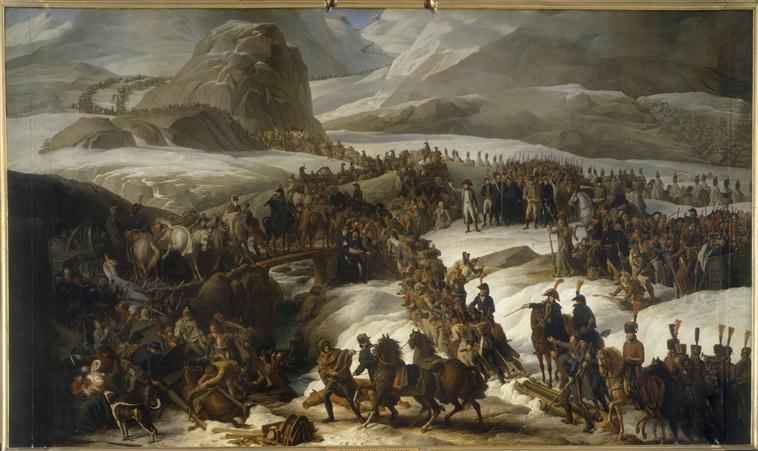 scène historique (montagne : Alpes, mouvement d'armée, Napoléon Bonaparte, état-major, Marmont Auguste Frédéric, Duroc Géraud Christophe Michel, Bessières Jean-Baptiste, Berthier Louis Alexandre, Murat Joachim, Beauharnais Eugène de)