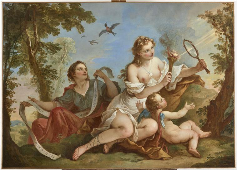 allégorie (Vénus, Cupidon, femme, miroir, torche, arbre, oiseau, putti)