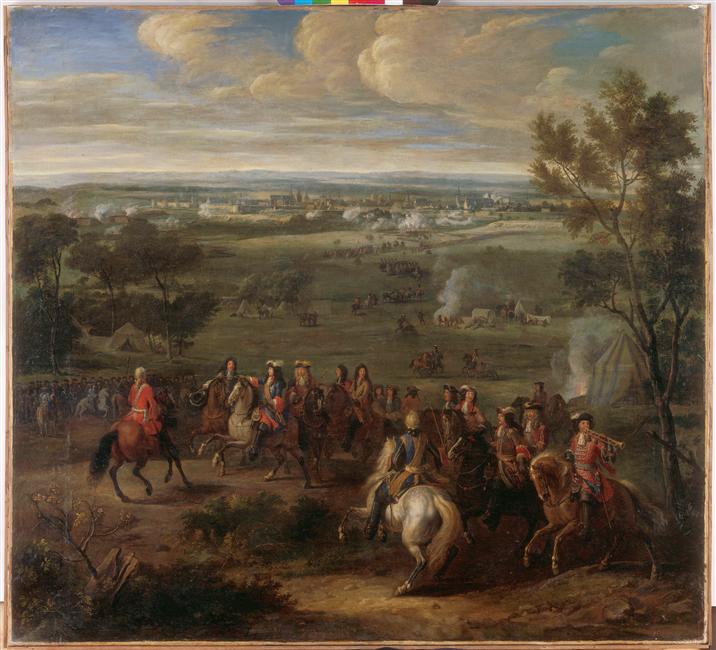 scène historique (prise de place : Cambrai, ville, fortification, mouvement d'armée, intendance, tente, revue, cavalerie, trompette, Louis XIV, état-major)
