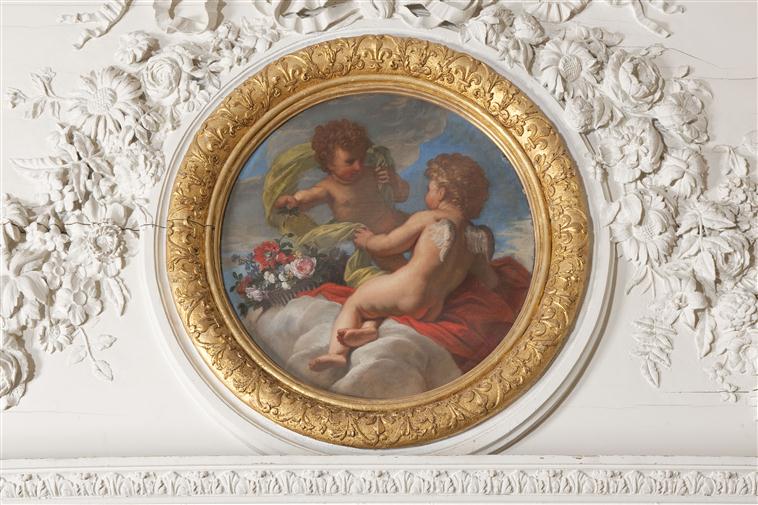 scène (allégorie : printemps, putti, fleur, nuée, effet de tissu)