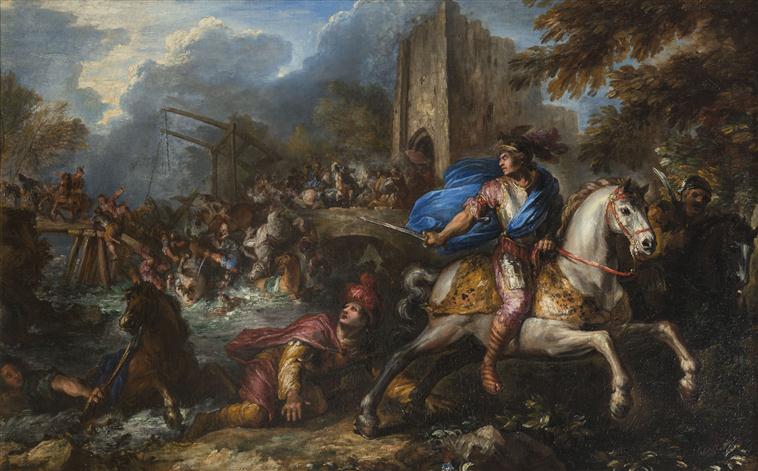 scène (assaut : cavalerie, armure, casque, épée, fortification, pont, chute)