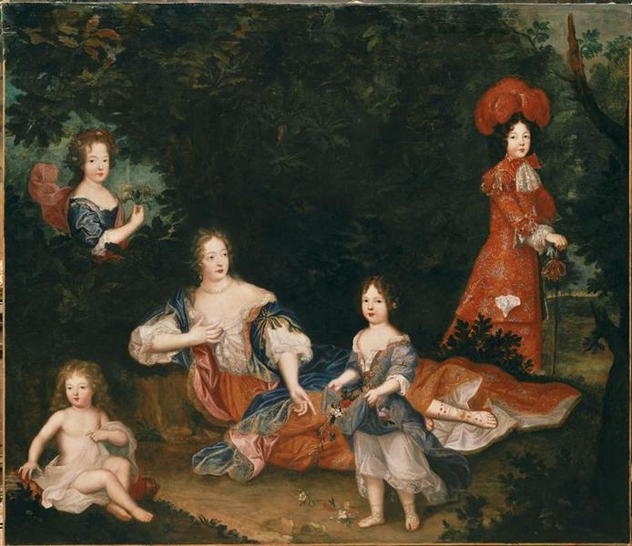 portrait collectif (famille) ; Rochechouart de Mortemart Françoise Athénaïs de (Montespan marquise de, femme, couché, de trois-quarts, robe, dentelle, broderie) ; Bourbon Louis Auguste de (Maine duc du, enfant, en pied, de trois-quarts, vêtement, canne, chapeau) ; Bourbon Louis César de (Vexin comte de, enfant, assis, de trois-quarts, carquois) ; Bourbon Louise France de (Nantes Mlle de, fillette, à mi-corps, de trois-quarts, fleur) ; Bourbon Louise Marie de (Tours Mlle de, fillette, en pied, de trois-quarts, robe, dentelle, bijou, fleur)