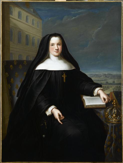 portrait (Marie Leczinska, femme, assis, de trois-quarts, religieuse, livre, couronne, intérieur) ; fond de paysage (abbaye : Chelles)