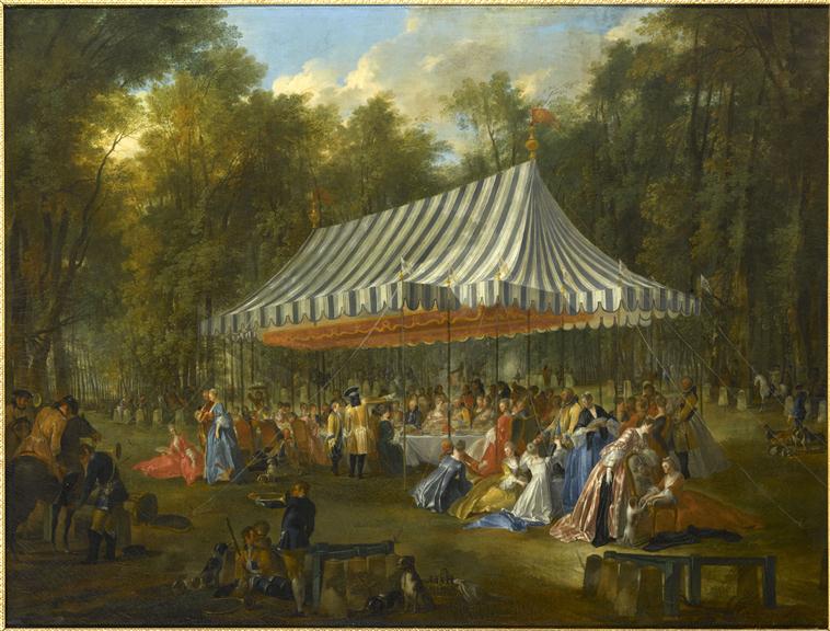 scène historique (fête champêtre : L'Isle-Adam, Conti prince de, Brunswick-Lünebourg prince de, repas, assemblée : noblesse, tente, vêtement, cavalier, trompe, forêt, chien)