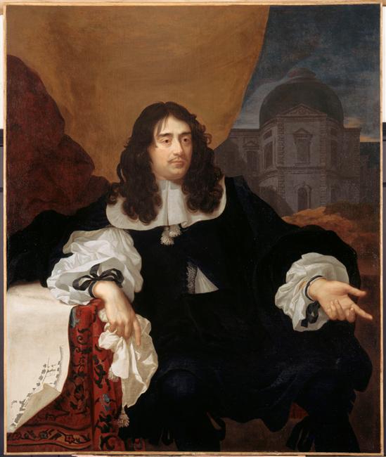 portrait (Le Vau Louis, homme, assis, de trois-quarts, accoudé, architecte) ; vue d'architecture