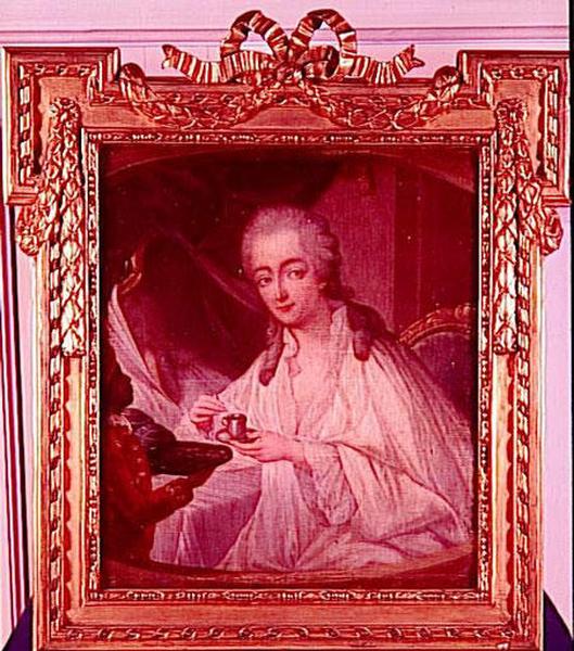 portrait (Bécu Jeanne, Du Barry comtesse, femme, assis, à mi-corps, de trois-quarts, boisson : café) ; serviteur