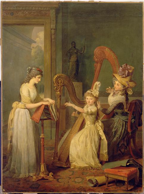 scène (Orléans Eugénie Adélaïde Louise d' : fillette, Mademoiselle Pamela, Genlis Stéphanie de, statue, objet : art du dessin, partition, enseignement pratique : harpe, chapeau, robe)