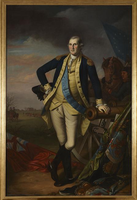 portrait (Washington George, Président de la République, en pied, de trois-quarts, habit : officier, drapeau, canon, cheval) ; mouvement d'armée