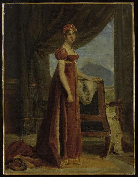 portrait (Beauharnais Hortense de, femme, en pied, de trois-quarts, robe, siège)
