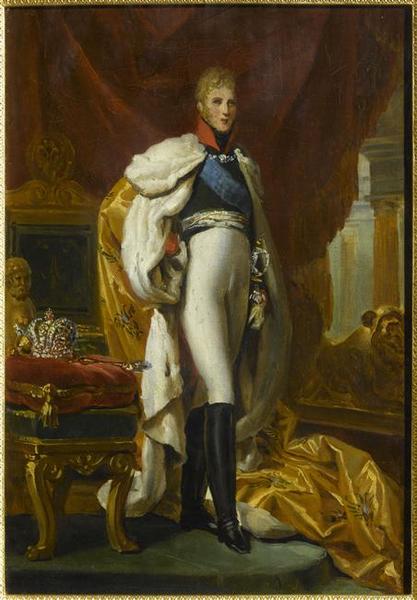 portrait (Alexandre Ier de Russie, Romanov Alexandre, homme, en pied, de trois-quarts, habit : empereur, couronne, manteau, attribut de la royauté, élément d'architecture)