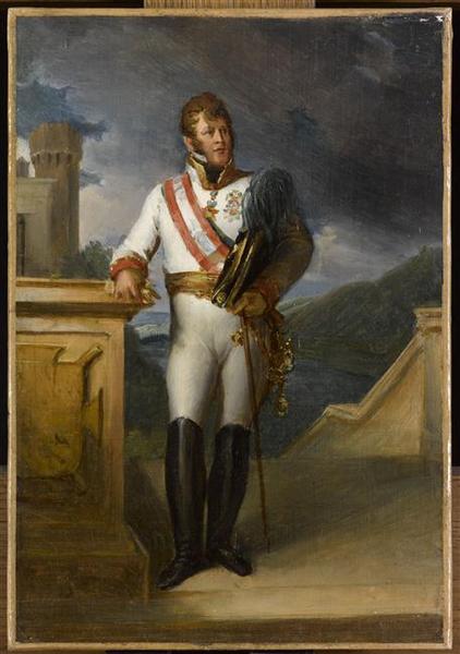 portrait (Schwarzenberg Charles Philippe de, maréchal, homme, en pied, de trois-quarts, habit : officier, chapeau, épée, escalier)