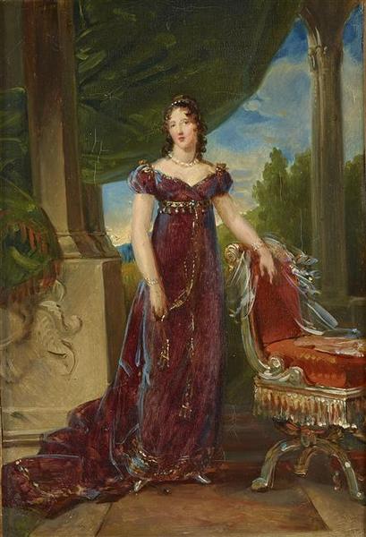 portrait (Courlande Dorothée de, Talleyrand-Périgord duchesse de, Dino duchesse de, Sagan princesse de, femme, en pied, de trois-quarts, robe, bijou, siège)